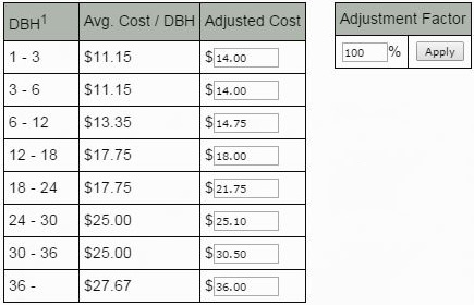 • If this cost schedule is too low you can raise it by setting your adjustment factor to something greater than 100%. For example, a 200% adjustment factor would double costs. Due to hazards caused when dead limbs shatter when they fall to the ground, the cost of removing a dead tree can easily be twice that of removing a tree that is mostly living.