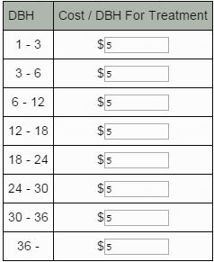 Removal costs vary widely. The calculator provides a cost schedule for removing ash trees and grinding stumps based on tree size (DBH), measured as the diameter at 4.5 ft above the ground. These estimates were made based on conversations with municipal arborists in Indiana during 2009. It is very likely that the real costs will differ in your community. Once you have a local estimate of tree removal and stump grinding costs for a size range (eg $11.15 per inch for trees with a DBH range of 3 to 6 inches) the cost for removing one 5" DBH tree and its stump would be: $55.75 ( or 5 X $11.15).