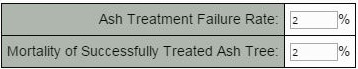 When EAB reaches your urban forest all the untreated trees will be killed. Although most treated trees will survive, a small proportion of the trees that are treated will be killed by EAB due to insecticide failure. Just like initial mortality of transplanted replacement trees, the Calculator will only apply the ash treatment failure rate once to the entire group of treated ash trees. After that year, the Calculator applies the mortality of successfully treated ash trees each year to reflect the rate at which trees die from factors other than EAB.